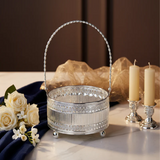 Elegant silver-plated round basket with intricate detailing, a sturdy handle, and ball feet. Perfect for serving dry fruits, sweets, or as a decorative centerpiece for festive occasions.