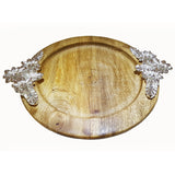 An essentially round tray with chamfered corners with a rose twig detailing on either edges. Crafted in mangowood the wooden tray is further polished and treated for food grade safety. A cast metal branch design, finished in silver plating details its outside edge on one side. Food today is a full sensory experience for the eyes, hands as well as the taste buds, and tableware has become an extension of this.
