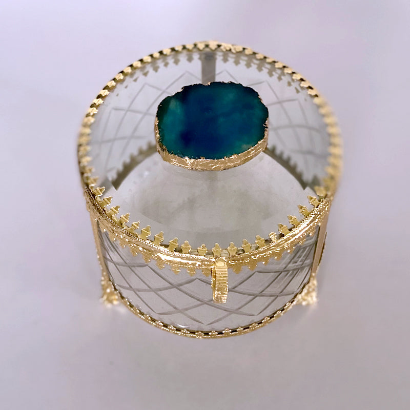 An uber-chic glass container with blue agate stone. The blue fluid agate stone features a fusion of distinctive shades of blue ranging from prussian blue to aquamarine blue. A stunning table topper to store nuts and chocolates .