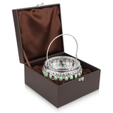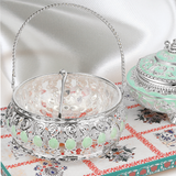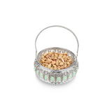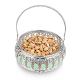 This extravagant circular basket boasts an expertly crafted design with a sea-green detail and intricate handle. Use it to up the level of elegance and charm at your gatherings. A little basket of joy, this tray almost literally becomes one when shared among people, with nuts, dry fruits and chocolates.