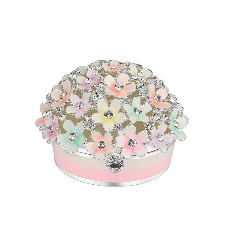 A round shaped trinket box featuring an elaborate design of spectacular colourful flowers studded with sparkling gems at the centre. It is ideal for gifting as well as holding your keepsakes.