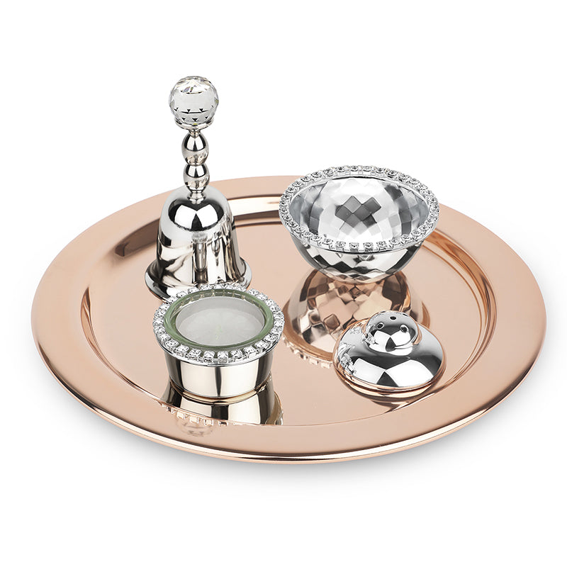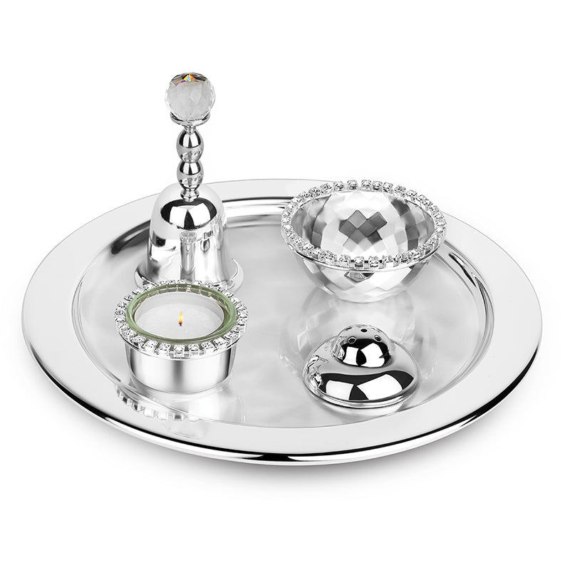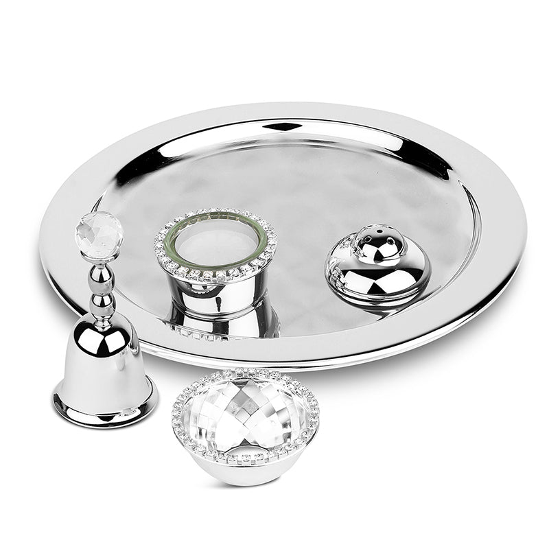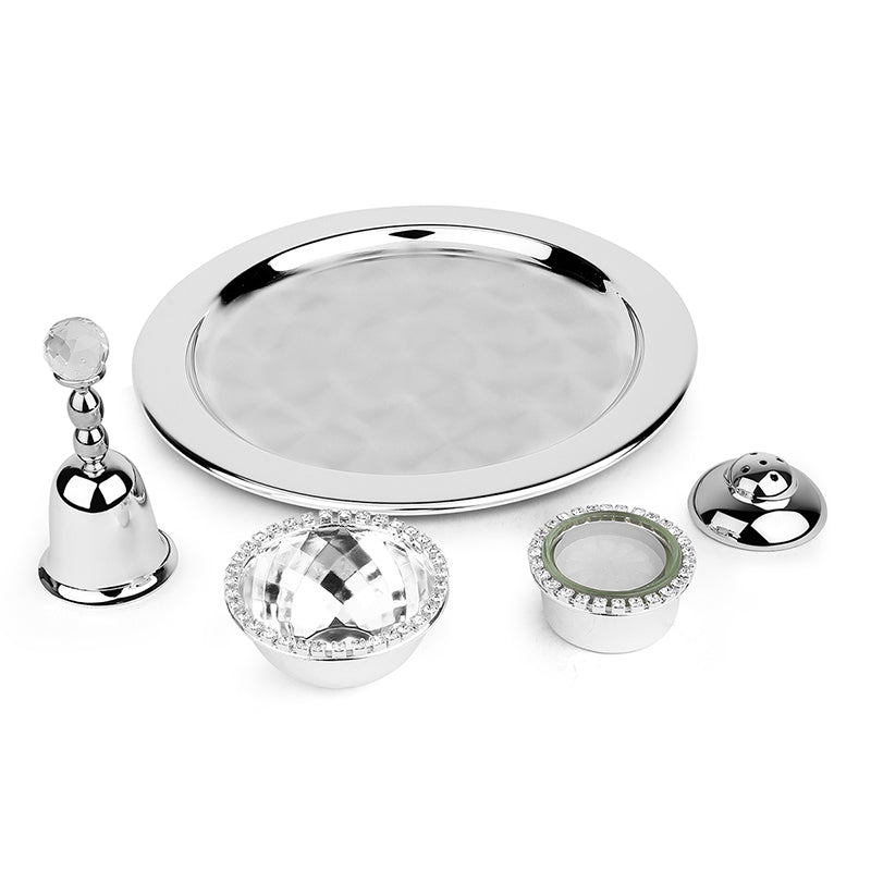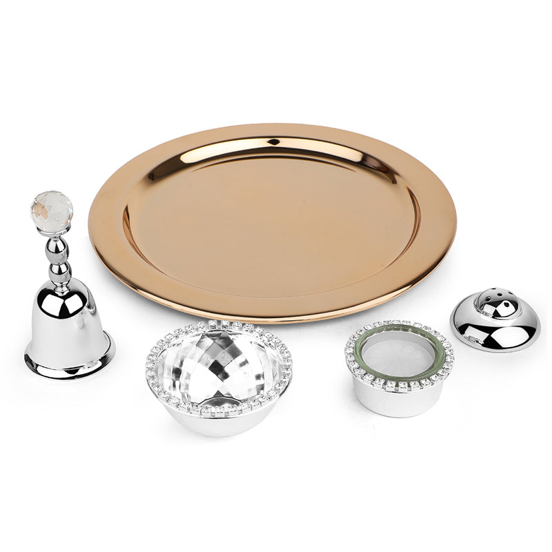 This crystal border, silver plated pooja thali is a must for your pooja rituals. Let your pooja room look the most delightful while you worship. This pooja thali contains a pooja bell, a diya holder with candle, incense stick holder and 2 different size bowls.