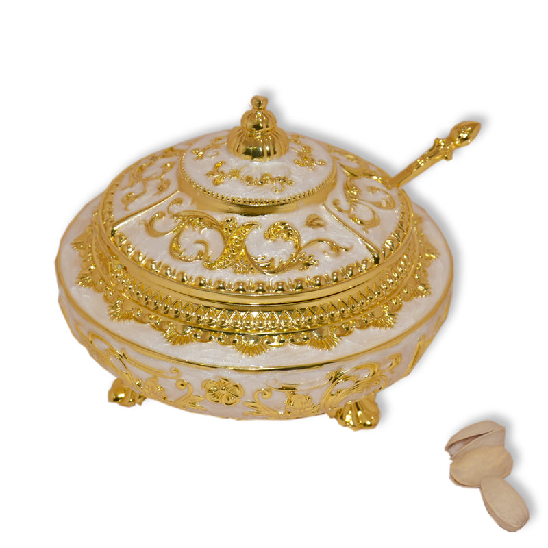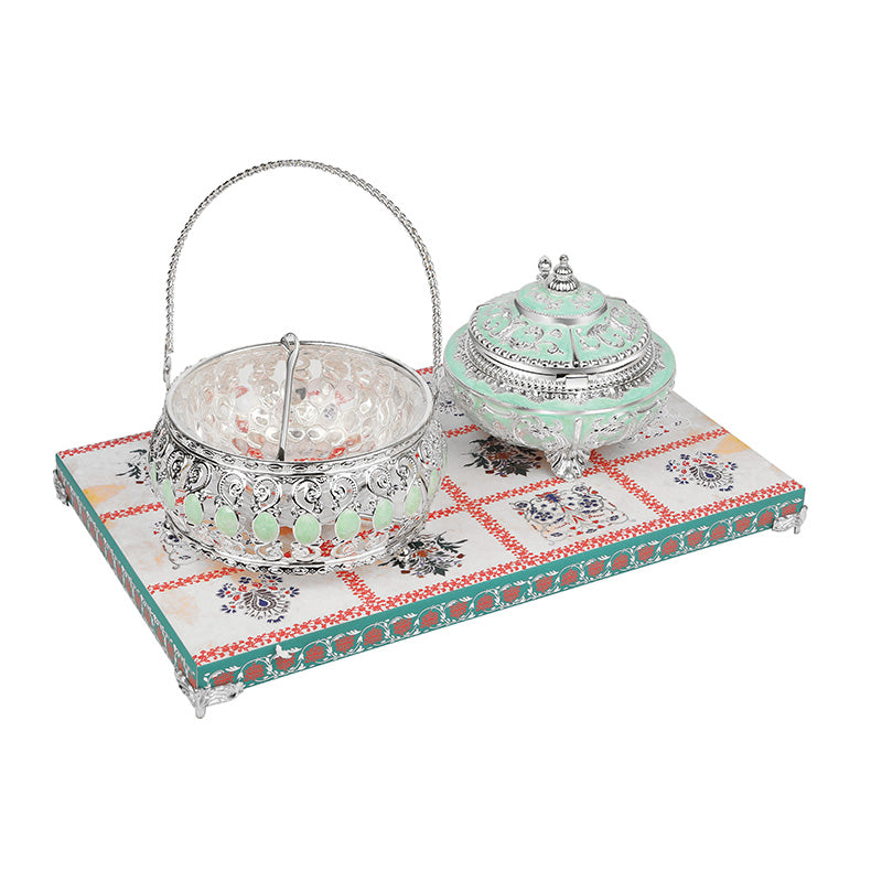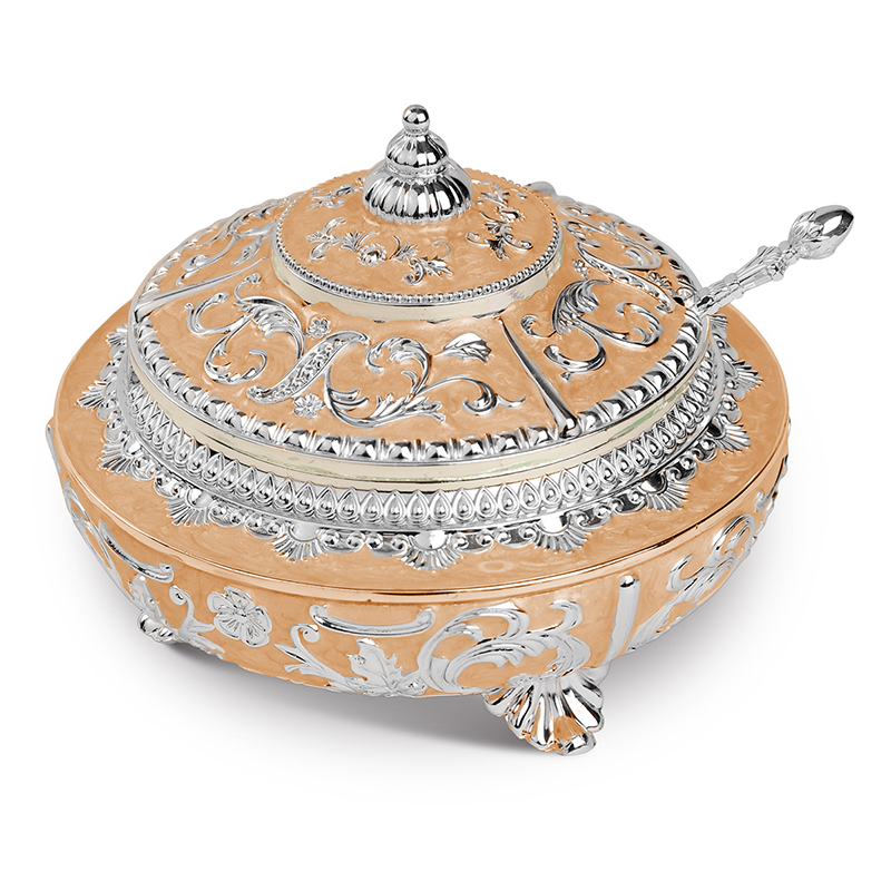 An exquisite sugar pot featuring a delightfully intricate design in silver. Designed with engravings, combination of pastel colors with slight touch of silver and gold, and use of subtle metallic elements and 3D textures along with a spoon. Available in beautiful pastel colours. Set of two & three available as well.