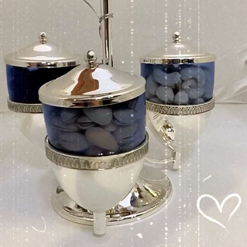 A delightful design in silver with three separate containers, it is the perfect way to tempt your guests with your offerings. Use it to serve dry fruits, sweets and much more.